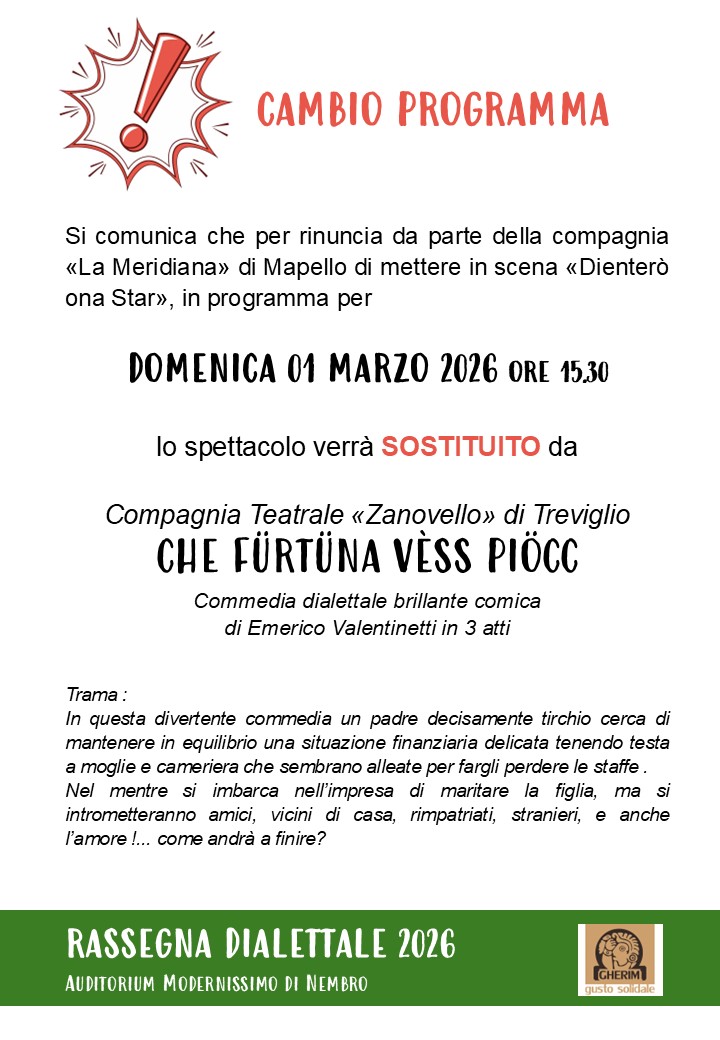 Lo spettacolo del 31/01 sarà ad ingresso gratuito con offerta libera a raccolta fondi per l’Associazione cure palliative di Seriate e per quella data non sarà possibile la prenotazione dei posti.
